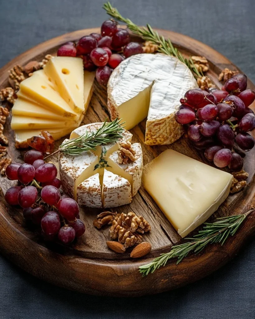 Décoration plateau fromage avec diverses fromages et garnitures élégantes.