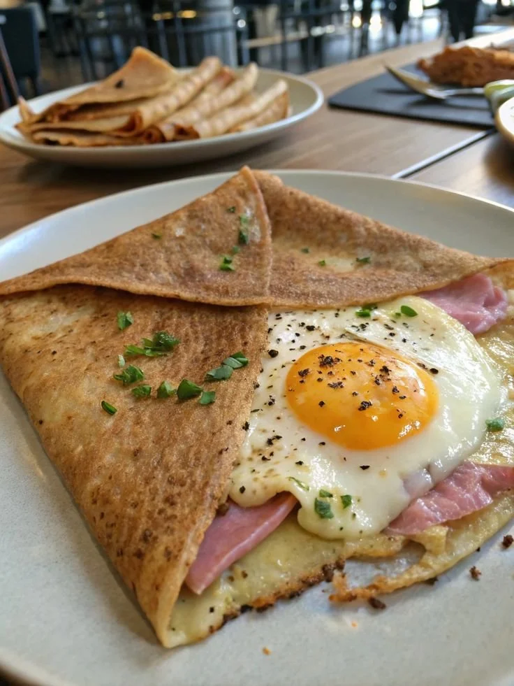 Une galette traditionnelle bretonne à base de farine de sarrasin, garnie de jambon, fromage et un œuf, parfaite pour un repas rapide et savoureux.