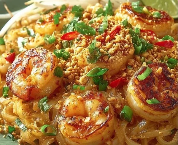 Pad thaï aux crevettes aux couleurs vives et ingrédients frais