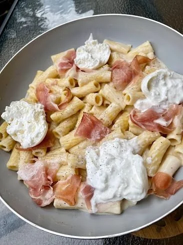 - Servir les pâtes avec la Burrata sur le dessus et garnir de prosciutto et de persil frais.