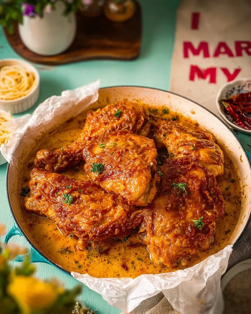 Laissez refroidir le poulet « Épouse-moi » avant de le placer au réfrigérateur dans un contenant hermétique. Personne ne peut résister au poulet « Épouse-moi » se conserve 2 à 3 jours au frais. Réchauffez doucement à la poêle à feu doux ou au four pour préserver la texture de la sauce. Évitez le micro-ondes si vous voulez conserver le velouté optimal.