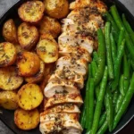 La technique est simple et directe : on marine, on rôtit les pommes de terre, puis on ajoute le poulet. Le poulet reste juteux grâce à la courte cuisson au four et au jus de citron final. Les haricots verts apportent une note fraîche et croquante en fin de cuisson. Suivez les étapes ci-dessous pour réussir ce poulet aux herbes et pommes de terre croustillantes.