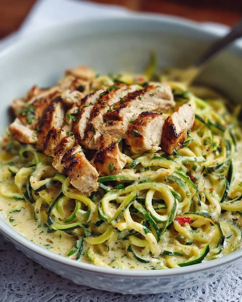 Une version légère et crémeuse du classique Poulet Alfredo, préparée avec des nouilles de courgette.