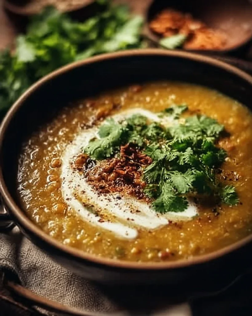 Soupe de lentilles au lait de coco servie dans un bol coloré